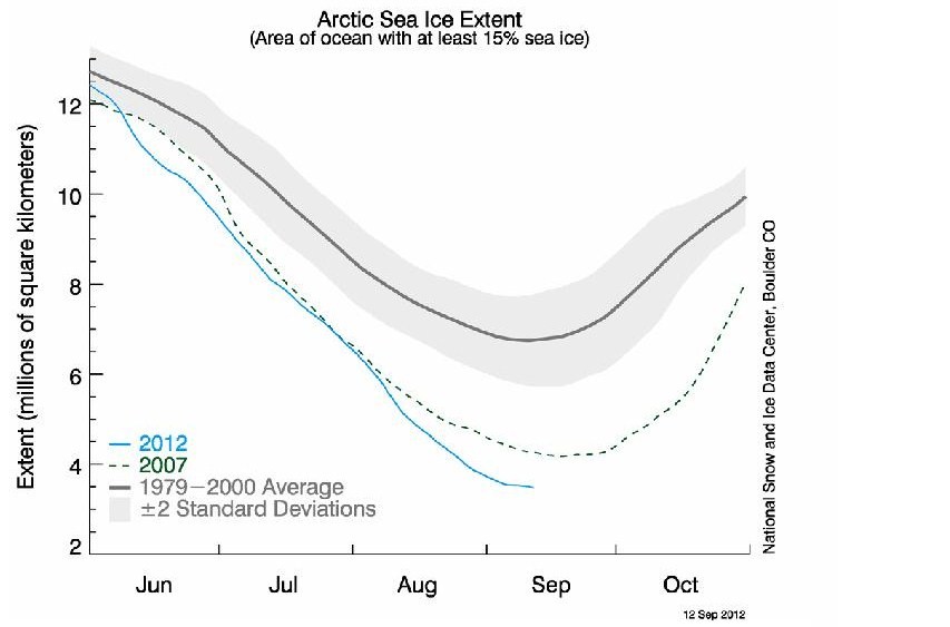 De esta forma, con fecha 27 de agosto de 2012, el organismo hace público que la cubierta de hielo marino en el Ártico se encuentra a su nivel más bajo, batiendo el record observado en 2007. De esta forma, se informa que la extensión de hielo se redujo a 4,10 millones de kilómetros cuadrados con fecha 26 de agosto. Esta cifra se sitúa en 70.000 kilómetros cuadrados menos que la registrada el 18 de septiembre de 2007, cuando alcanzaba 4,17 millones de kilómetros cuadrados.