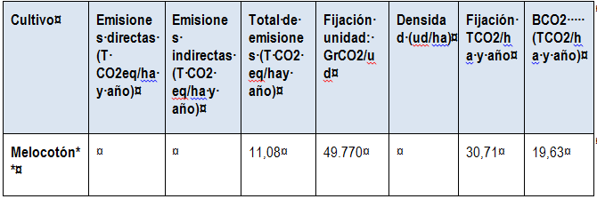 Para la estimación del balance de carbono de los melocotoneros de la Comunidad Valenciana, tomaremos como fuente datos de fijación de CO2 y emisión total, ofrecidos por el “CEBAS-Consejo Superior de Investigaciones Científicas” y “LessCO2-Región de Murcia”. Tabla 1: “Emisiones, fijación y balance de CO2 de los melocotoneros”
